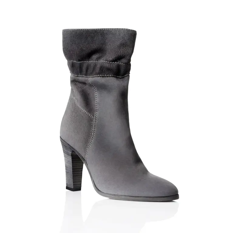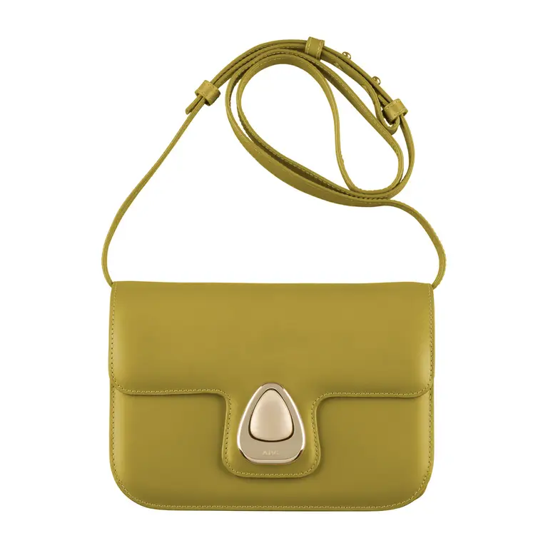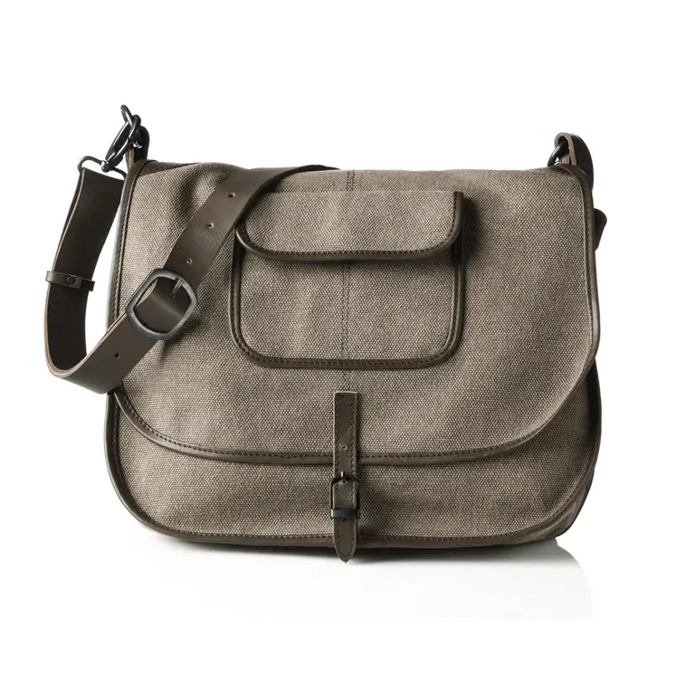 Packshot e-commerce – 4 vues d’un sac bandoulière en cuir lisse gris avec fermoir métal doré : vue face, vue 3/4 montrant l’épaisseur et la bandoulière réglable, vue dos lisse, gros plan intérieur sous rabat avec compartiments et doublure suédée ; détourage sur fond blanc, éclairage studio.